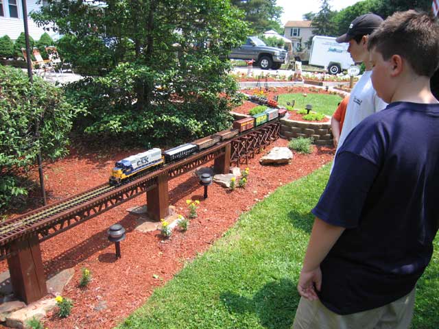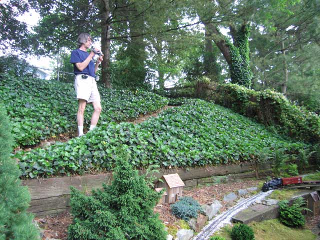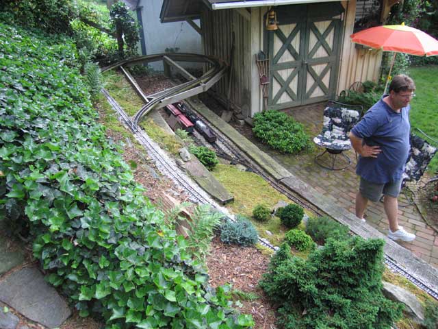 Now on to my favorite layout of the day. Paul Welsh's Wasatch Mountain Railway. It is built on a terraced hill with very steep grades and lush beatifull landscaping.