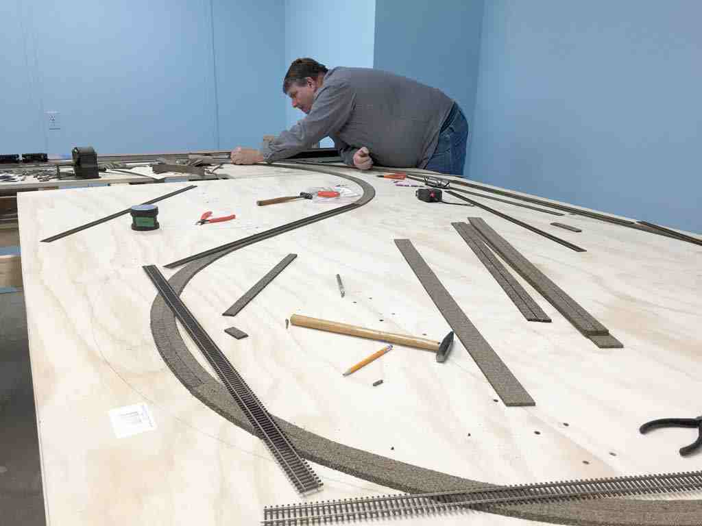 Laying out the track on top of the roadbed. I was helping Doug lay this all out, but I was also taking the pictures while we were working.