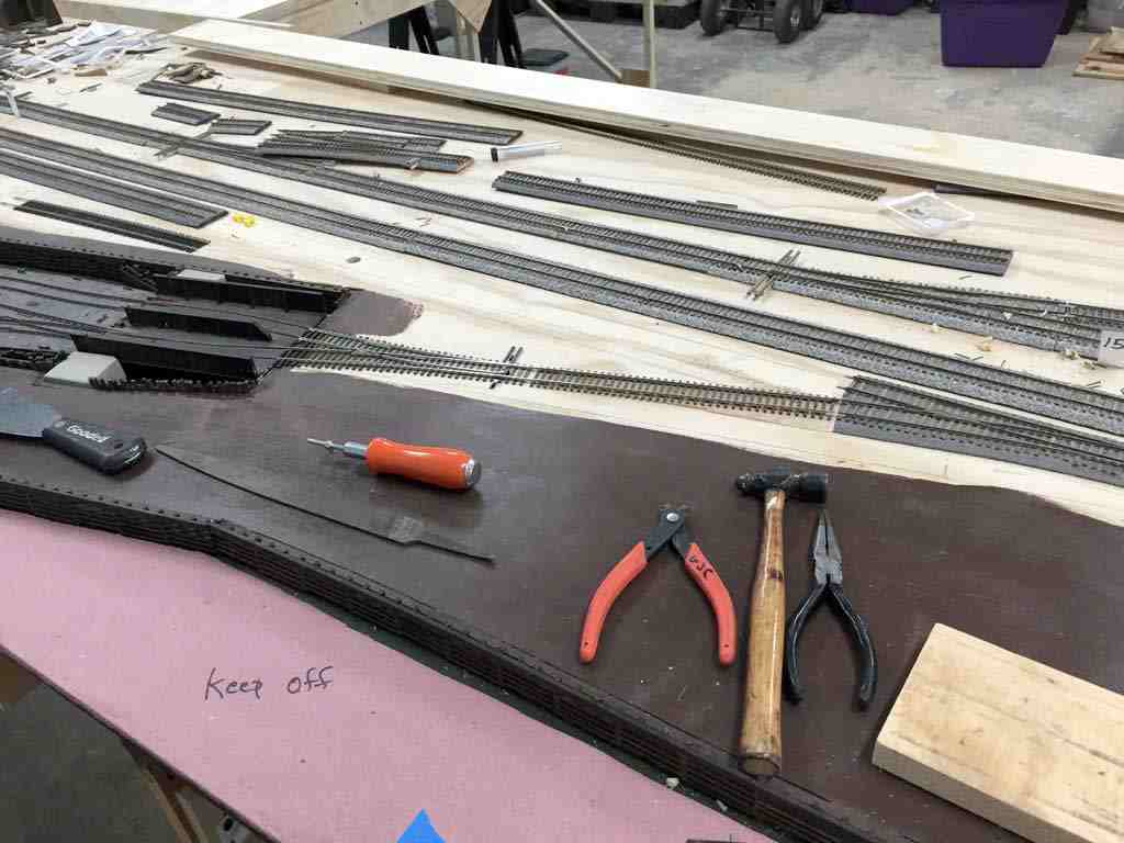 Now that the car floats are in their final positions, I've had to re-work the track alignments off of the lead track. There's also a height transition from the balasted track to the plywood base.