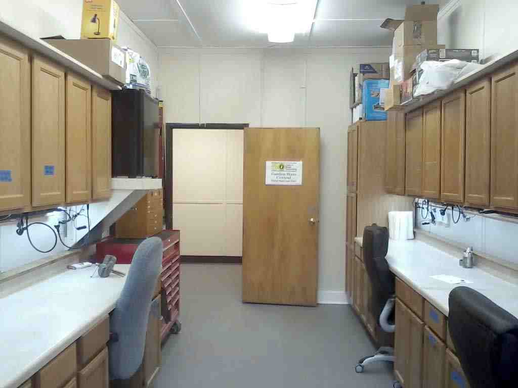 The workshop got its final touches and has been finished. All that's left is to lay out the test track on the shelf on the right side. We've already started storing supplies on the shelves above the cabinets.