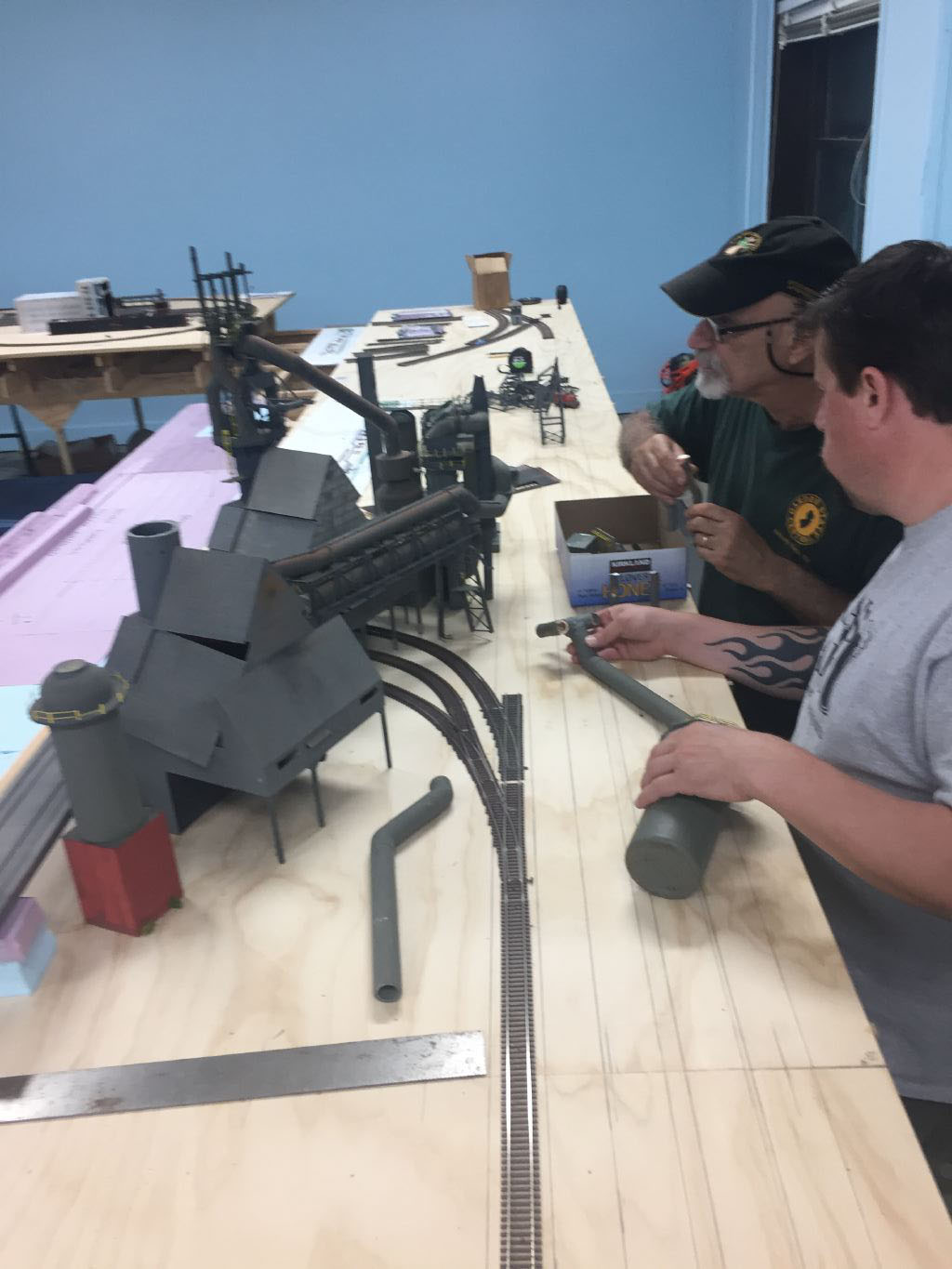 Jules and Mike begin to lay out the track and place our existing blast furnaces to see how it all fits.