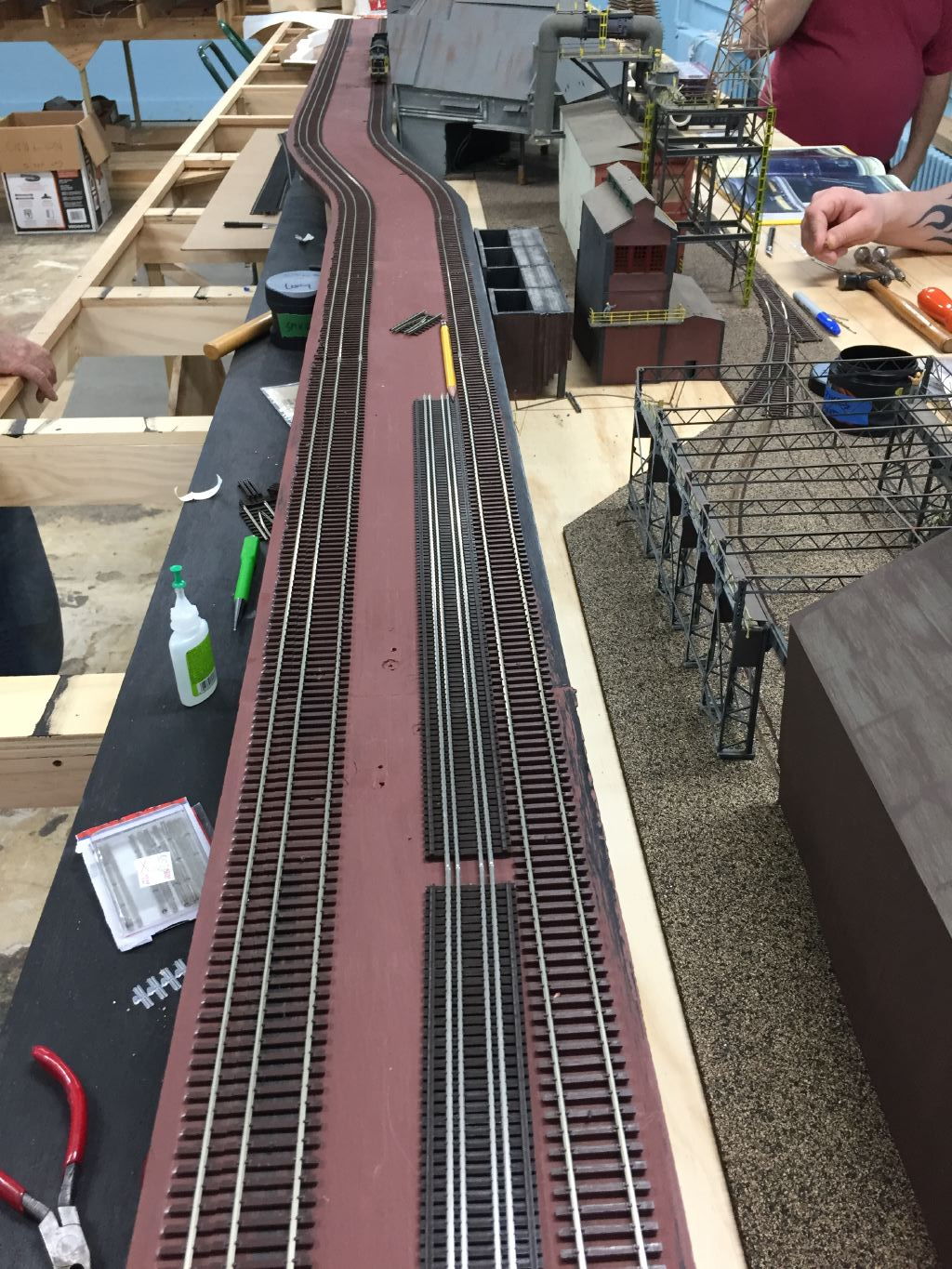 We needed to go back and replace some of the standard track on the right with bridge track on a section that will be exposed between several of the Bethlehem Steel buildings.