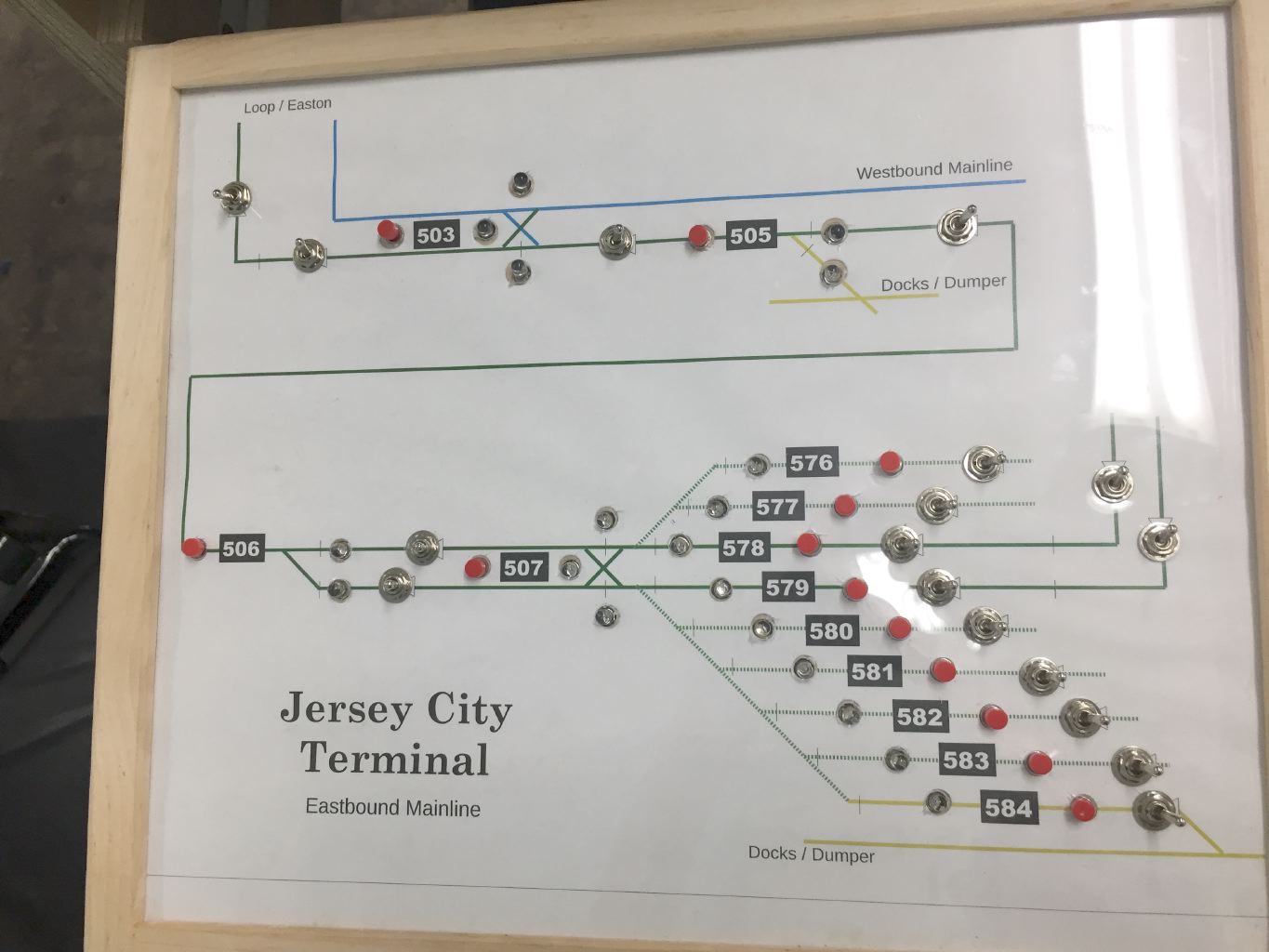 The finished panel. One down, three more to go. The large white numbers in the black boxes are the DCC Route number. If you enter this number on your throttle, it will also throw the switches without using the panel buttons.