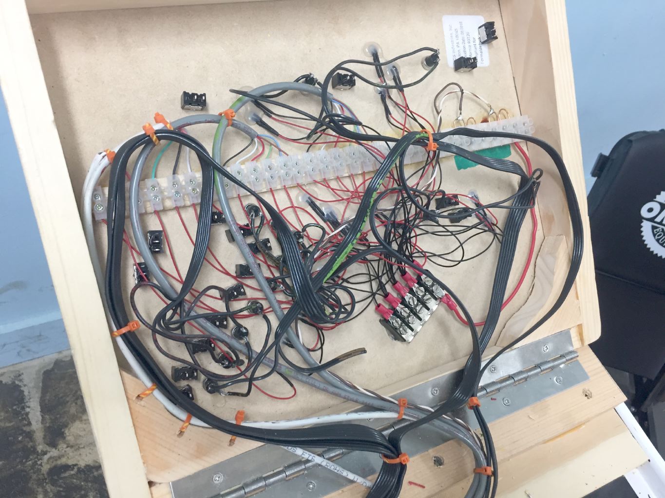 We made the panels open up so we could get to the wiring easily. This is just the push buttons for the switches and the switch indicator lights. We still have to add the wires for the block switches.