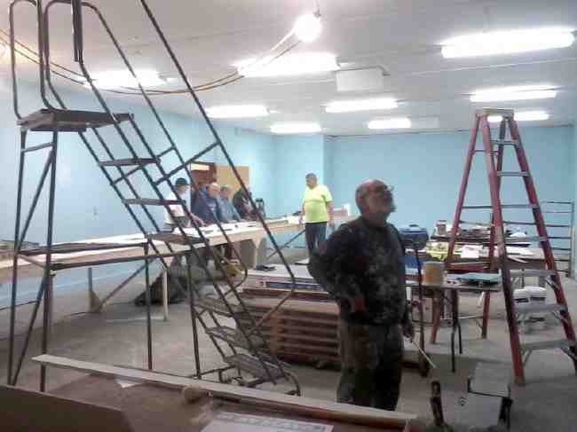 George is inspecting the touch-up paint work while the track crew is going back-and-forth on where to put a switch.