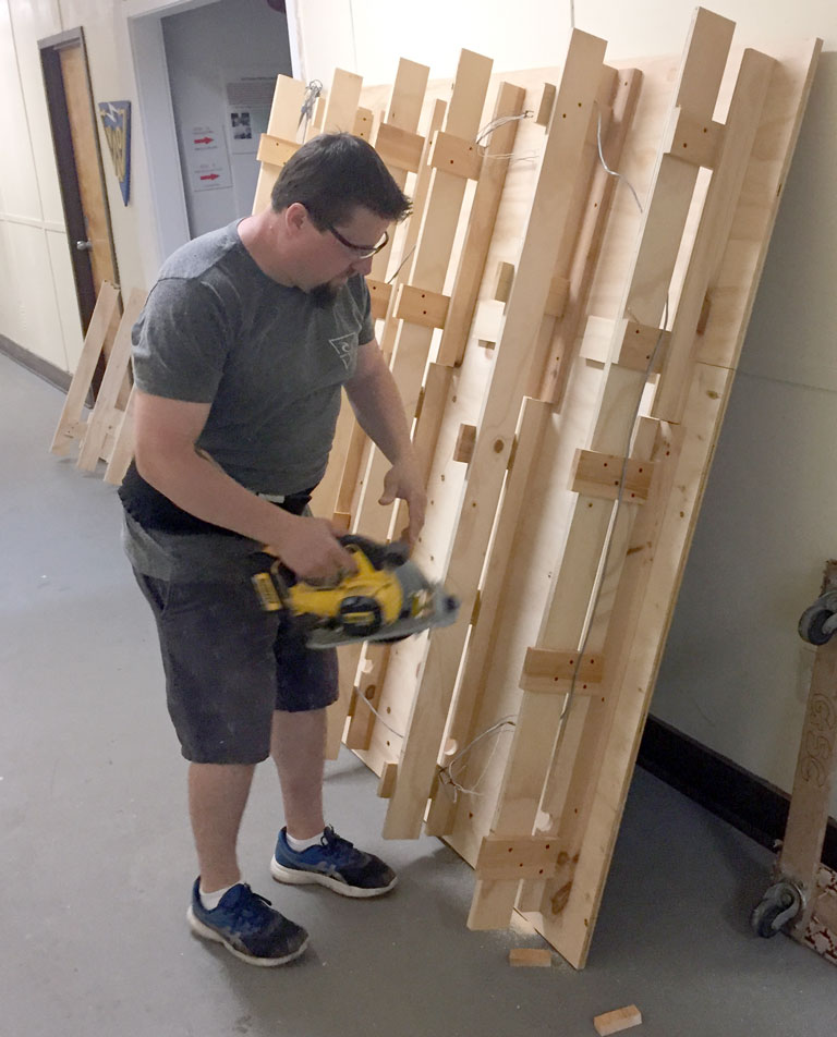 Mike trims off the excess wood from the risers on the temporary loop in the hallway. Its a lot easier to work on it on its side in the hall than when it was still attached to the box frames.