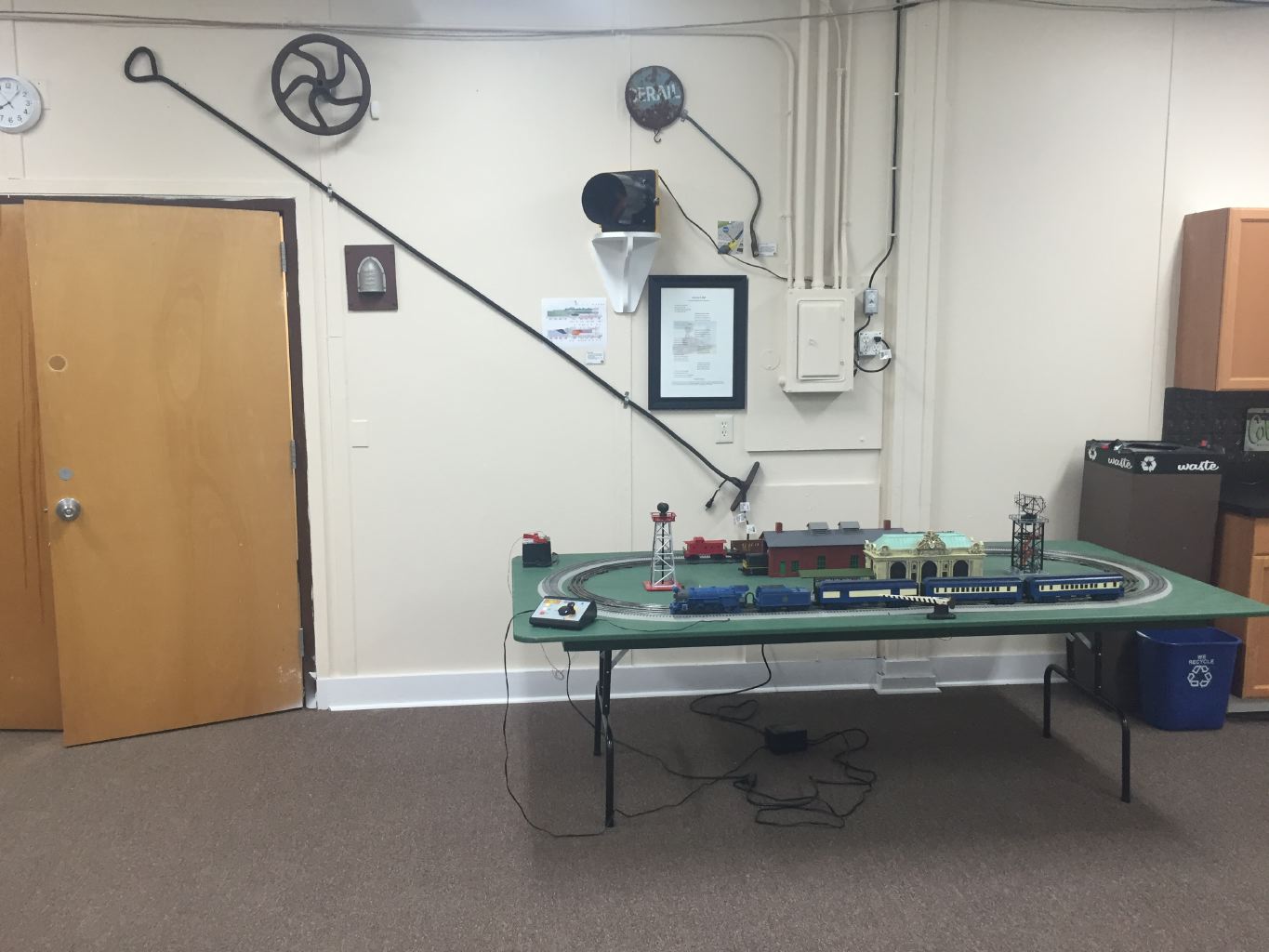One of the two small ‘hands-on’ layouts in the room, and some of our bigger train artifacts on the wall. Where else could we put the 10 ft steam engine fire box rake?