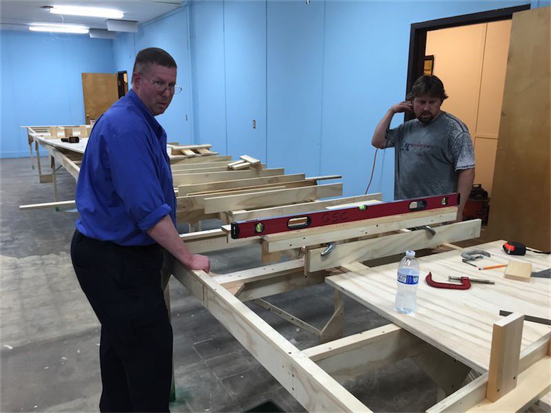 Two risers down, 32 more to go… The combination of risers and joists will give us enough clearance to put the switch machines under the layout deck without hitting the box frame.