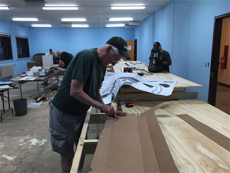 Bob J. is cutting out templates for the two car floats, dock and boat so we can get the alignment correct on the layout.