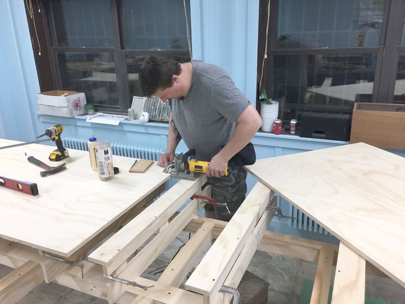 Putting the biscuits on the next piece of plywood deck.