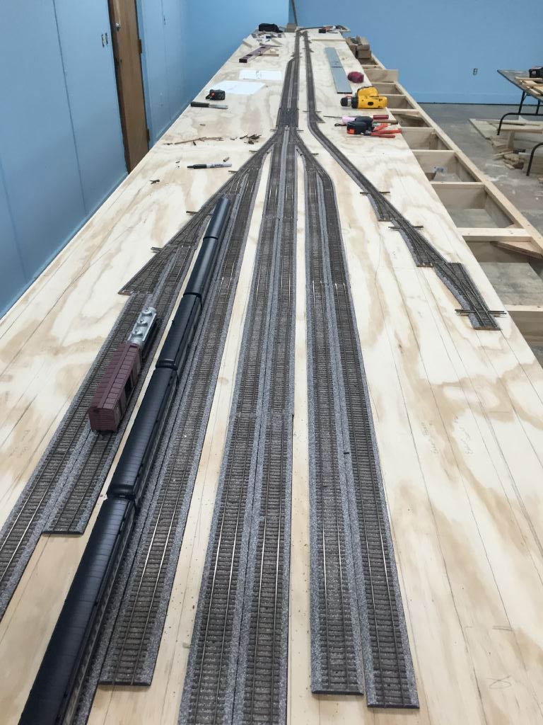 Looking back from the terminal, tracks seven and eight have been installed. On the right, the first switches for the yard lead have been installed.