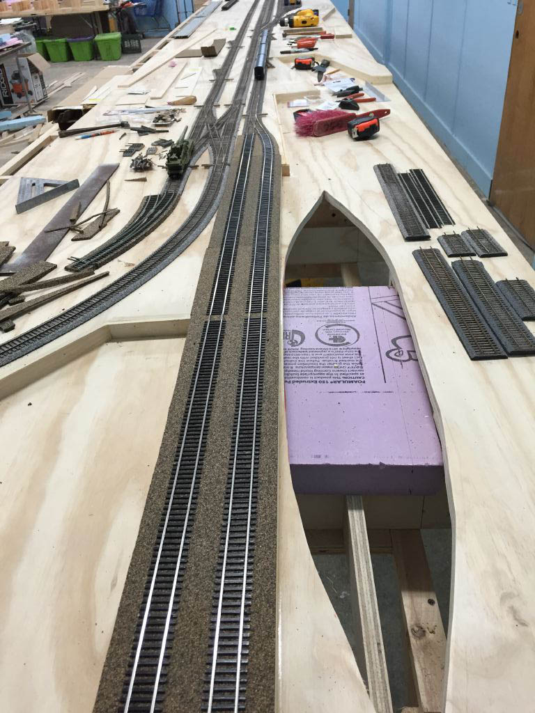 The hole on the right is for the USS Scout. It was a cargo ship used by Bethlehem Steel. The tracks in the middle are for the dock that the Scout is tied up to. These dock tracks will eventually be covered with styrene to make it look like they are in concrete. That's why there is no ballast on them.
