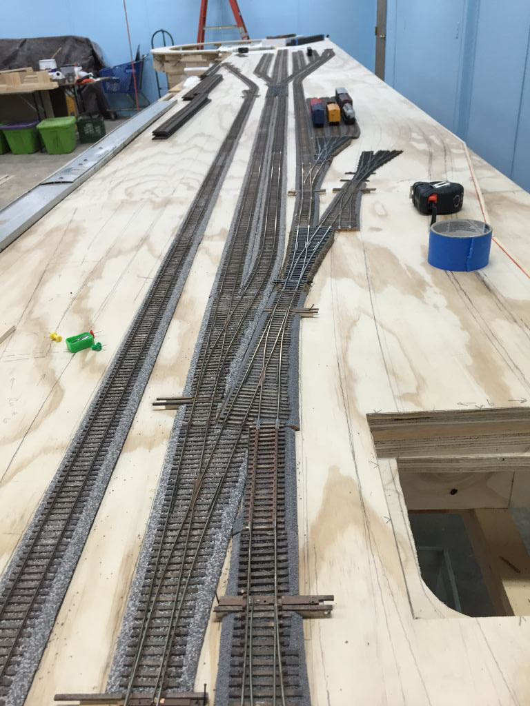 The west end of the inbound full coal yard is completed and the switches for the outbound empty coal yard is being roughed in.