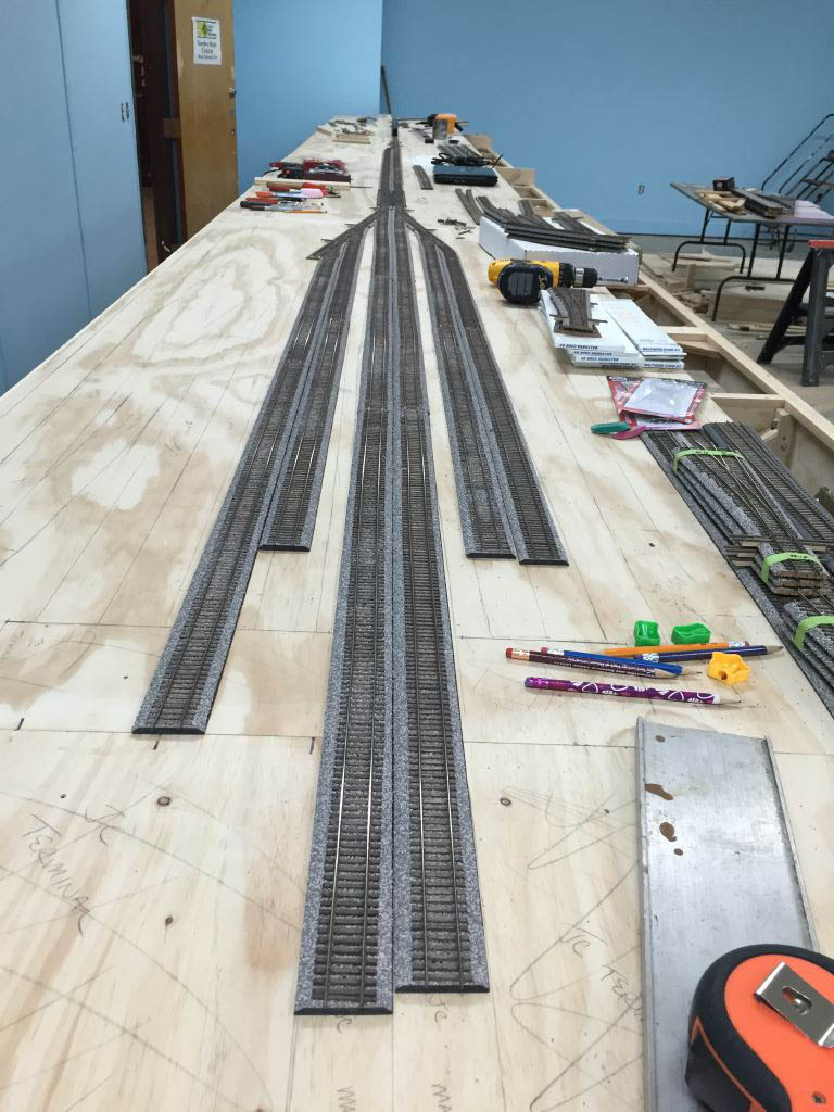 The first six tracks installed. The two longer tracks in the center will go through the station into a hidden loop. This will allow us to have continuous running during an open house.