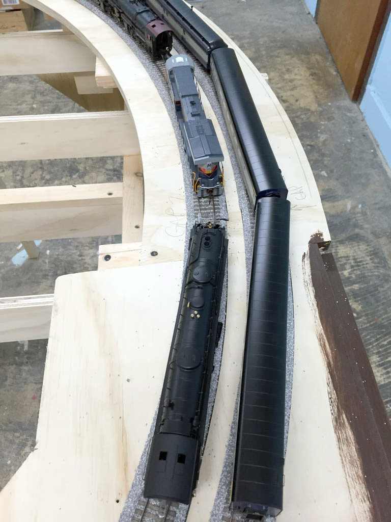 Happily we went with 2-1/2 inch spacing on the hidden loop tracks. This was a test we did with full size passenger cars on the outer loop, and a 2-8-8-4 and ES-44ac on the inner track. Plenty of room between them.