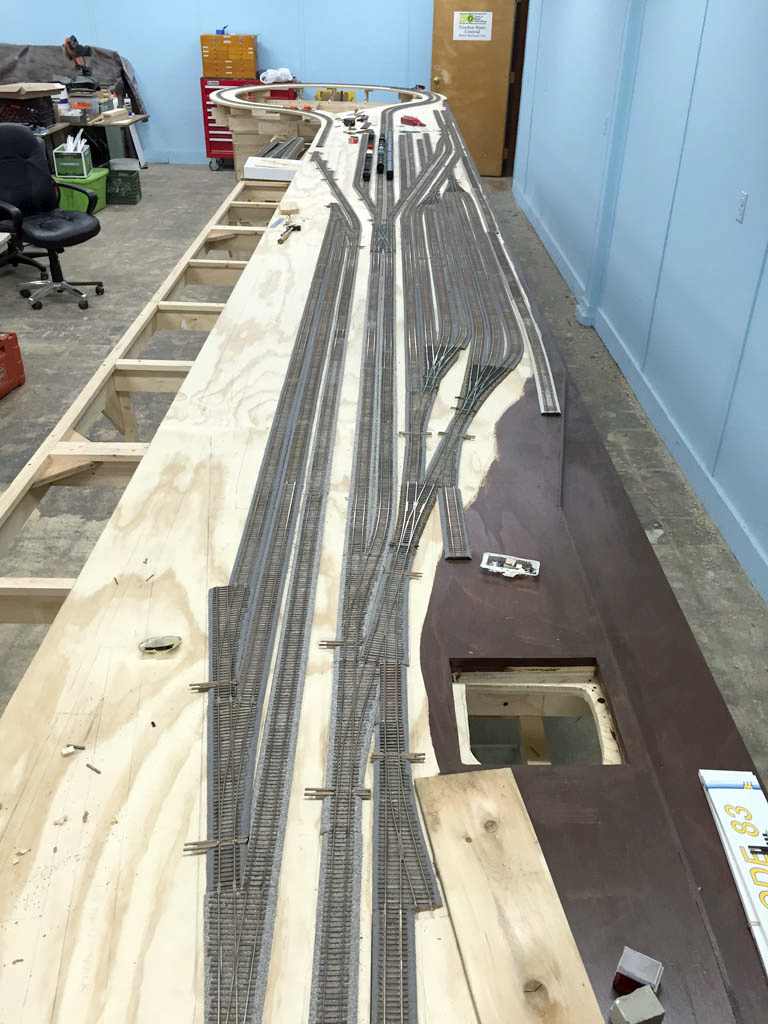 A medium sized view of all the track so far. We are waiting for the rest of our track order to come in to complete the yard area on the left. The right side is complete with the exception of the lead track for the coal dumper.