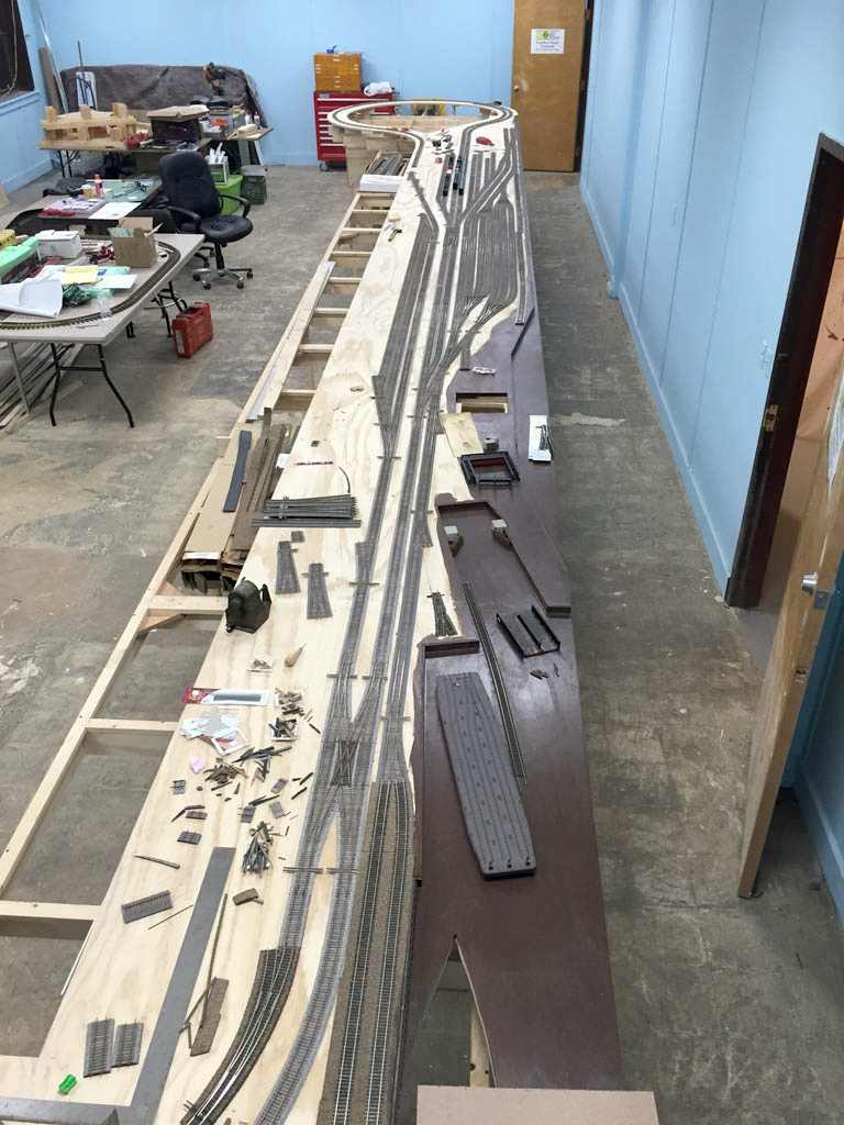 Here's a unique view of the entire Jersey City section of the layout. I put the camera up against the ceiling at the end of the room. Its funny how small 40 feet of benchwork looks like from this angle. The trains you can barely see at the other end of the layout are the 5 car passenger set from some of the other pictures. There's also a 2-8-8-2, 2-6-6-2, 2-8-8-4 and ES-44ac hidden down there.