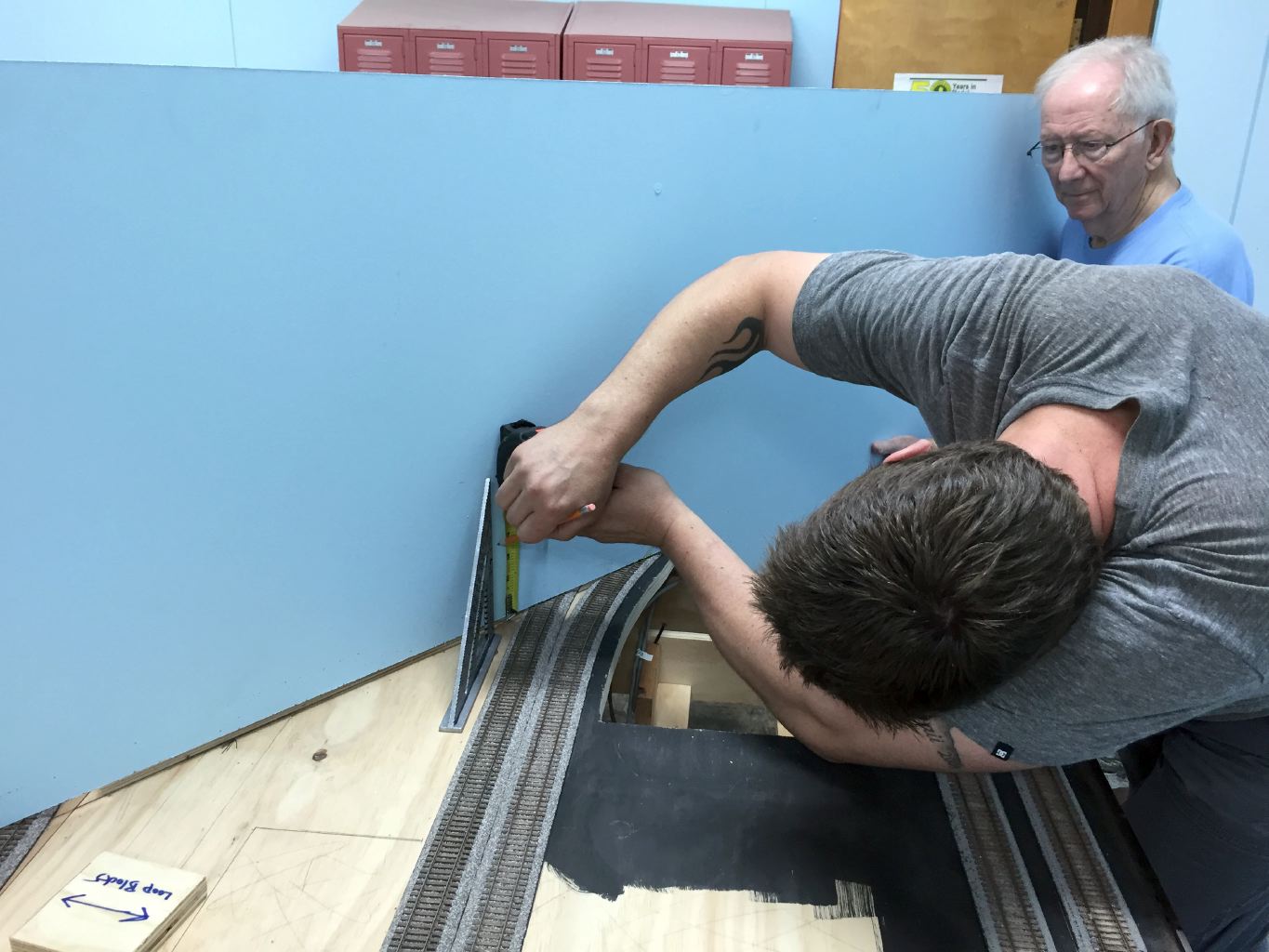 Mike marks out the hole where the Jersey City mainline will go under Wilkes-Barre while Lou steadies the backdrop.