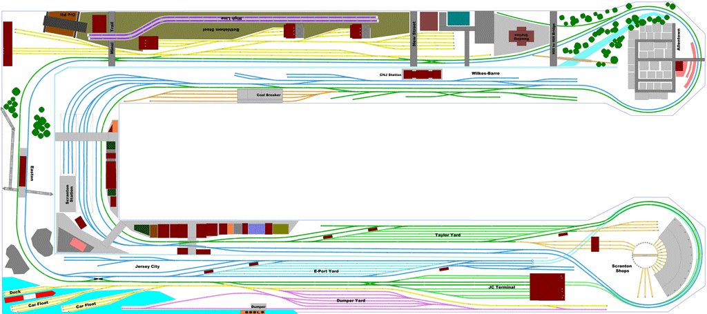 We start on the bottom right at Jersey City. That track would be at 0 inch height, and there is a hidden loop under the Scranton roundhouse on the right. The loop goes from behind the Jersey City Terminal to the right side of E-Port yard. It's really there for show running, but could be used as a lead track for the yard.